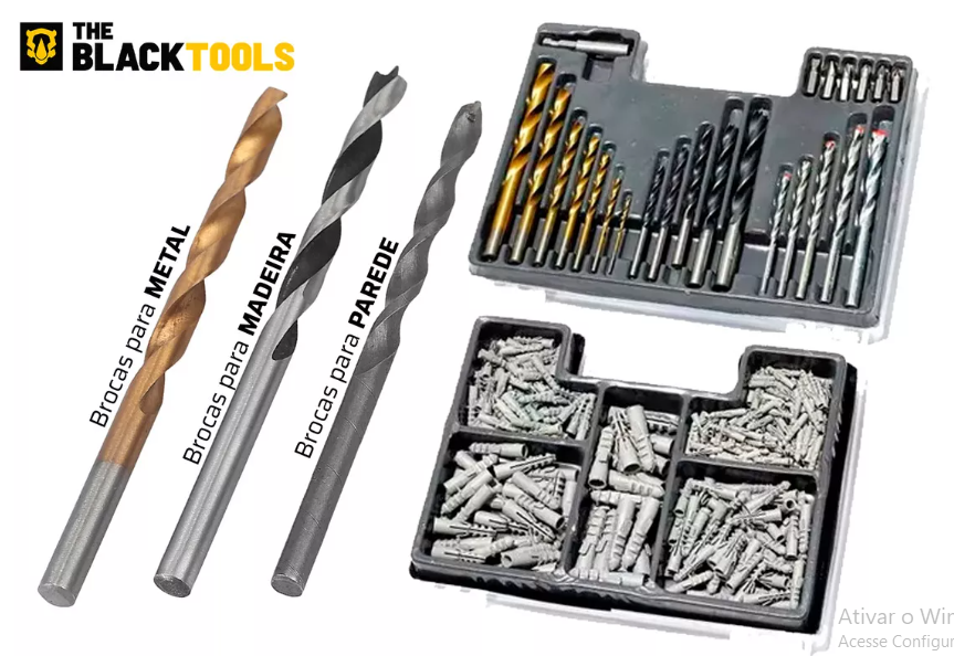 O Jogo de brocas bits e buchas com 300 peças The Black Tools é ideal para uso doméstico e hobby, conta com as brocas e bits e buchas com as medidas mais comuns.